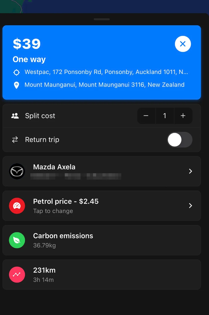 This app also shows the carbon emissions of your car when driving to your selected destination, along with the distance to that place one way/ return.