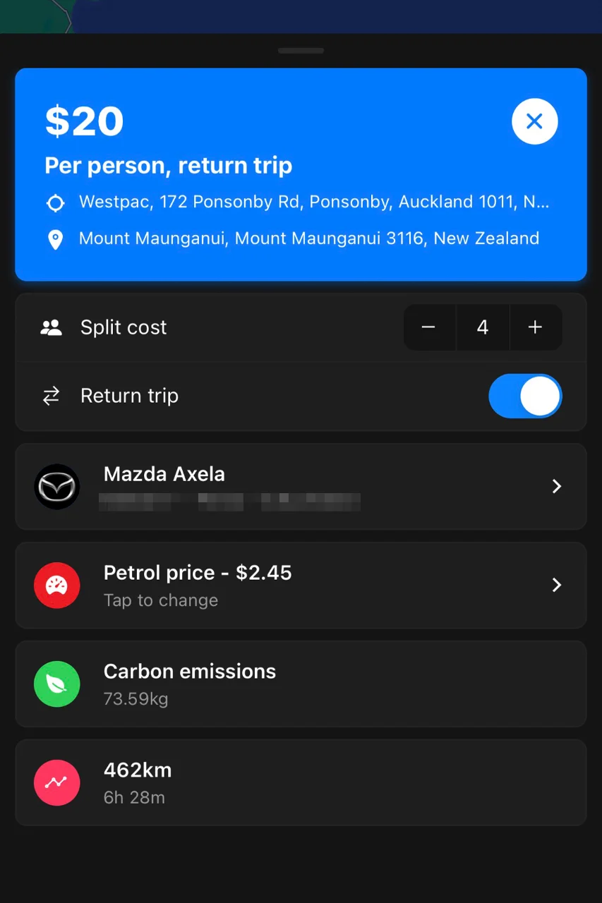 If you're splitting the petrol payment, then you can increase the number on 'Split Cost' by pressing on '+' sign and it will show how much each person will pay for the petrol.