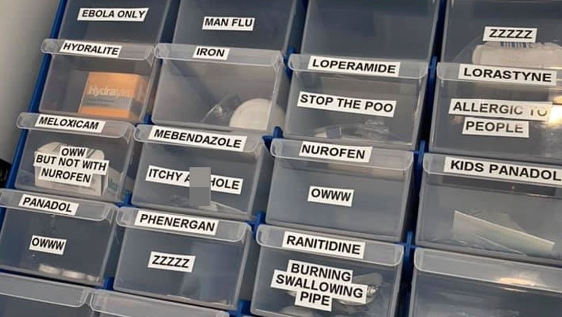 An Australian nurse has organised her family's medicine cupboard in a hilarious way that makes it easy for them to understand.