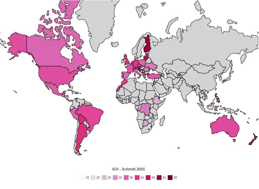 ?Psychologist Dr David P. Schmitt gathered all of the personal information gathered from an extensive list of answers to form the SOI figure, this can be hard though as most of the data was self-reported by over 14,000 participants.