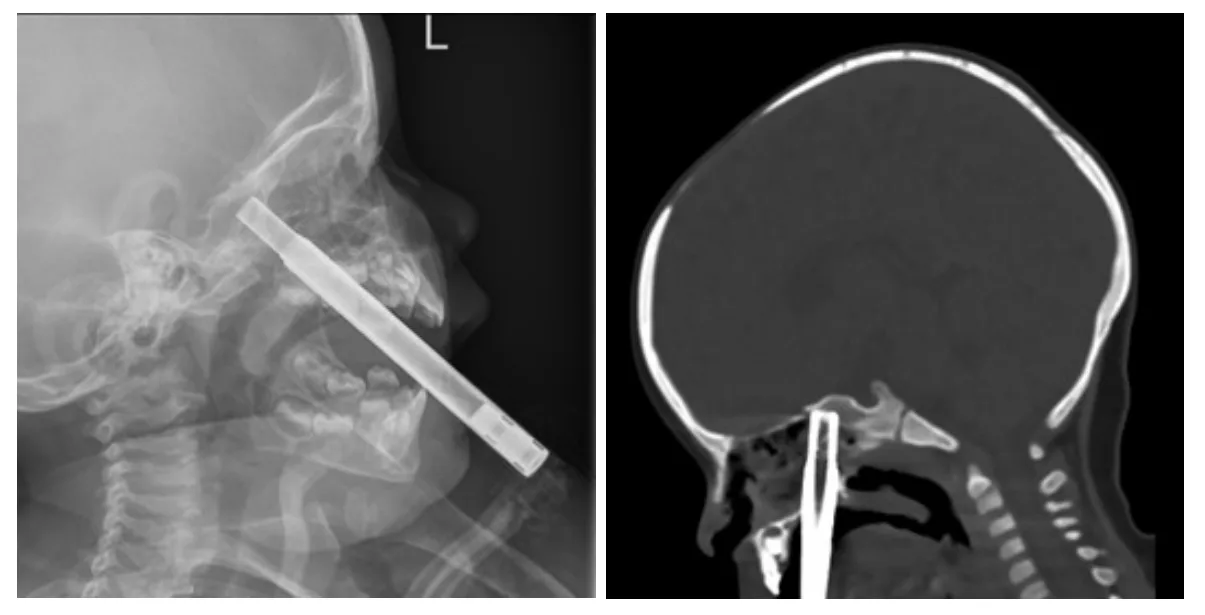A follow-up CT scan confirmed one end of the straw was lodged in the toddler's sphenoid bone, which sits right at the base of the cranium.