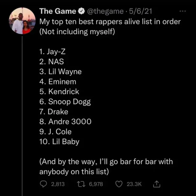 Fans have also called the rapper out online by sharing screenshots of The Game's 'top ten best rappers alive list' from 2021 and you wouldn't believe how highly he rates Eminem.