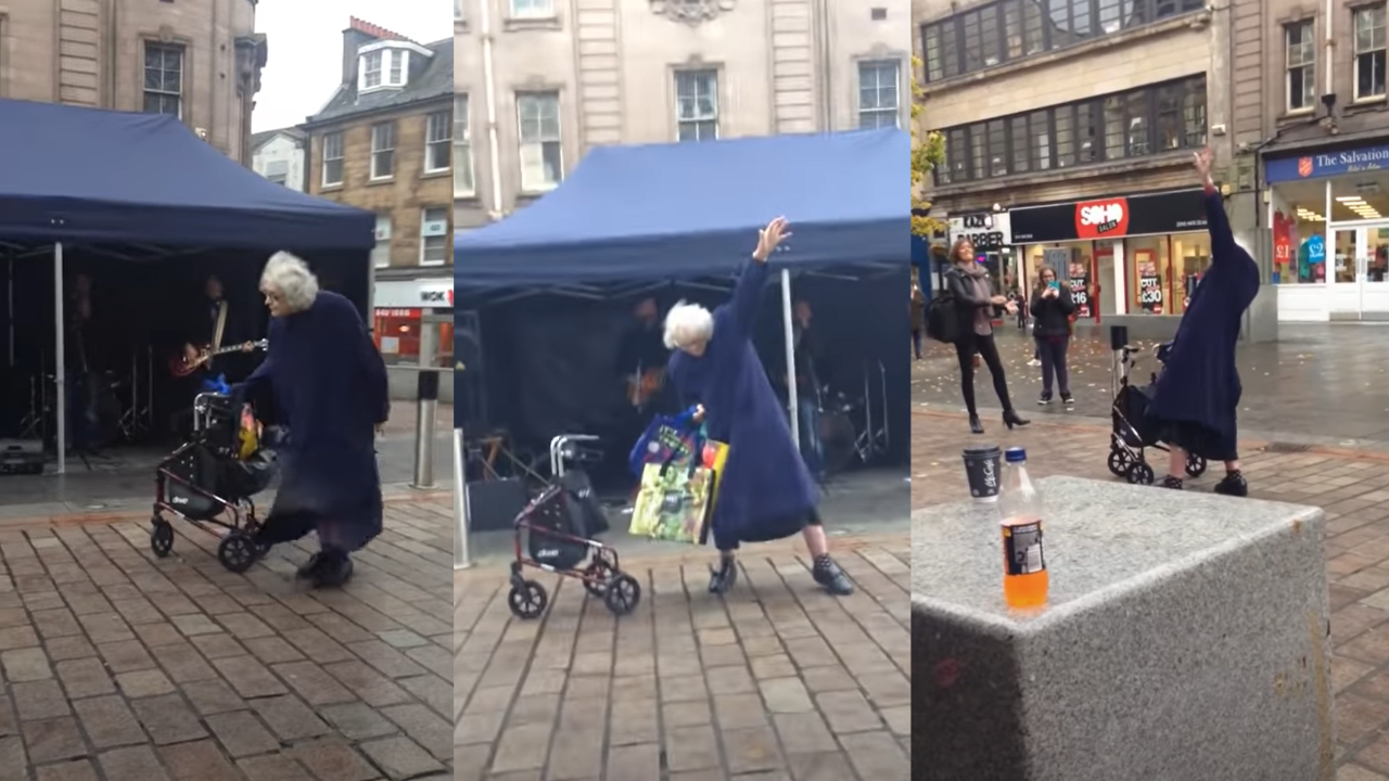 AC/DC cover band 'Badboys' were performing at a festival in Scotland, and belted out a cover of AC/DC's iconic 40 year old tune, 'Highway To Hell'. This old bird, walking past in her walking stroller, stopped when she heard the song and not only danced to the tune, but struck poses, played up to the crowd and rocked the fuck out.