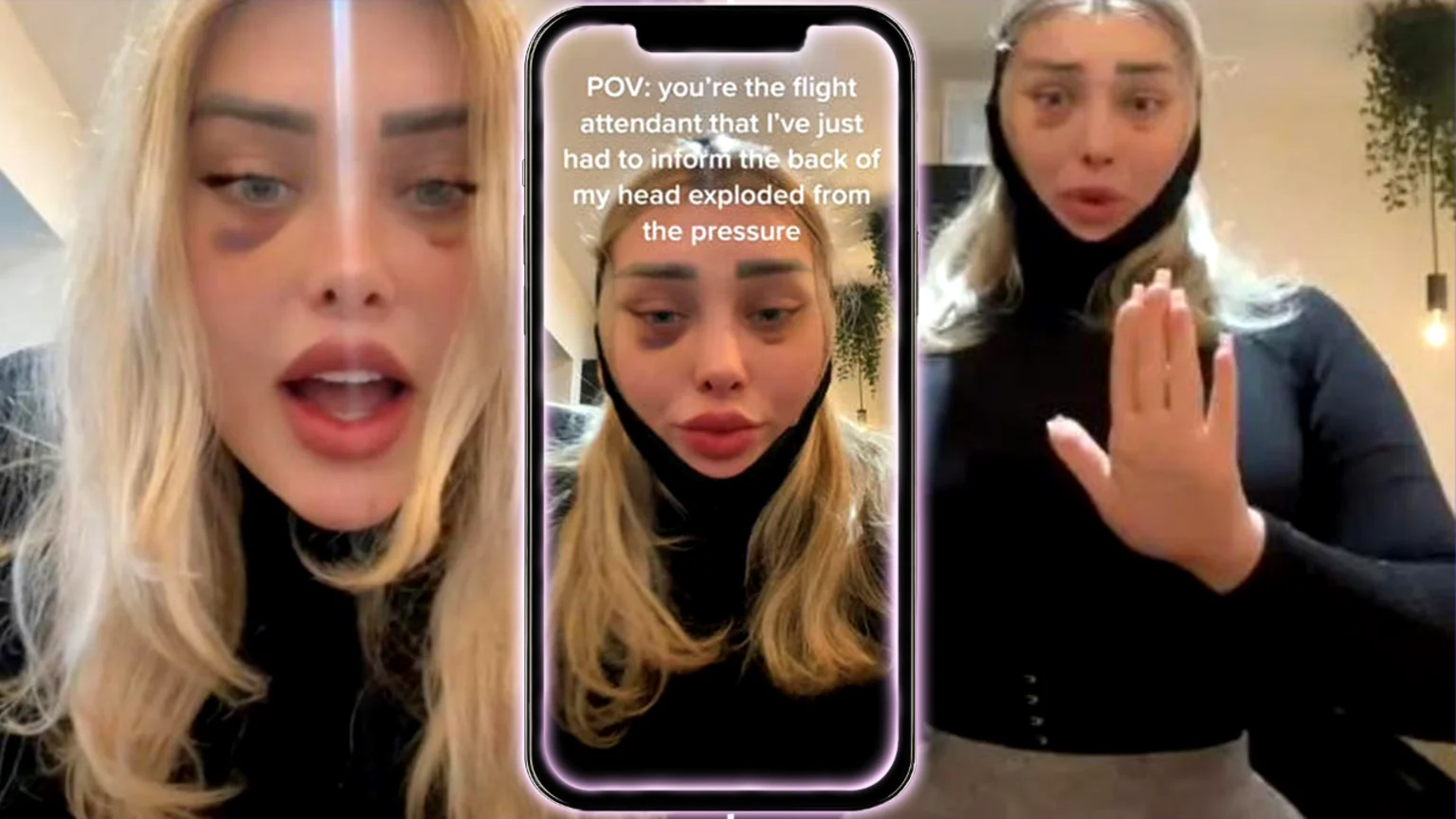 An OnlyFans model has shared a TikTok claiming that her head "exploded" during a flight after a neck lift and cat-eye cosmetic surgery.