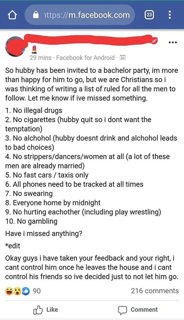 A wife has made the rounds on the internet after her list of strict rules and instructions on what her husband and his friends could (but mainly, could not) do on a stag do was uploaded to Facebook.