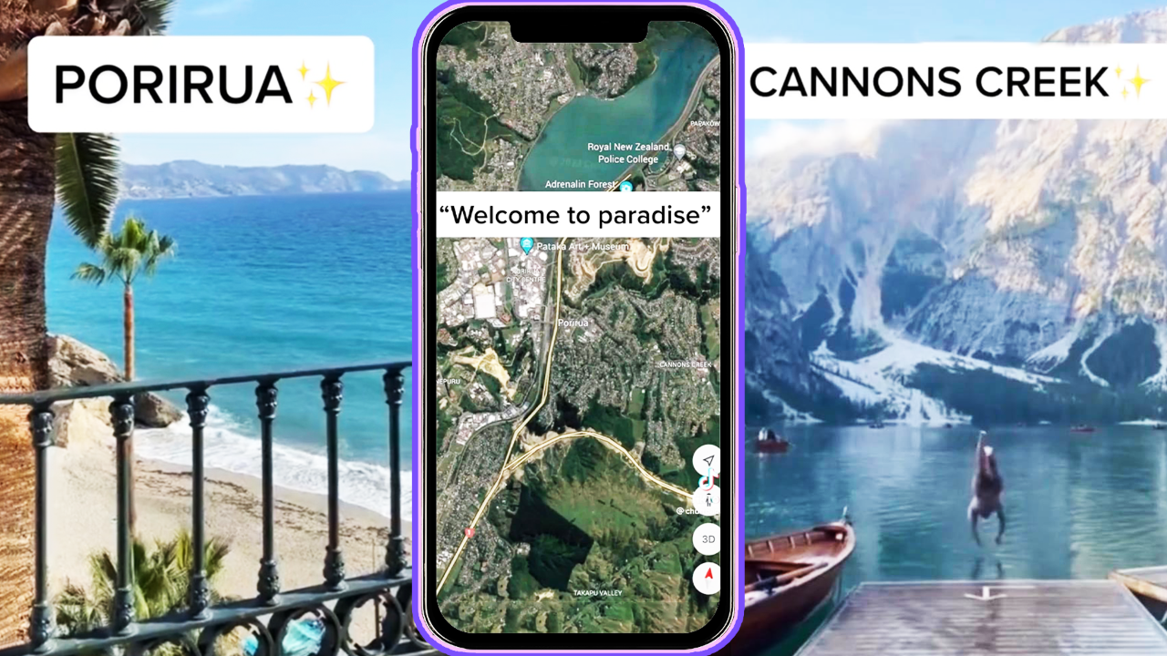 "You've never been to the most beautiful place in the world?" writing on the TikTok reads as we see the Google Earth globe spinning. "Well then, let me show you," it continues as we zoom in on New Zealand and then, finally, Porirua.
