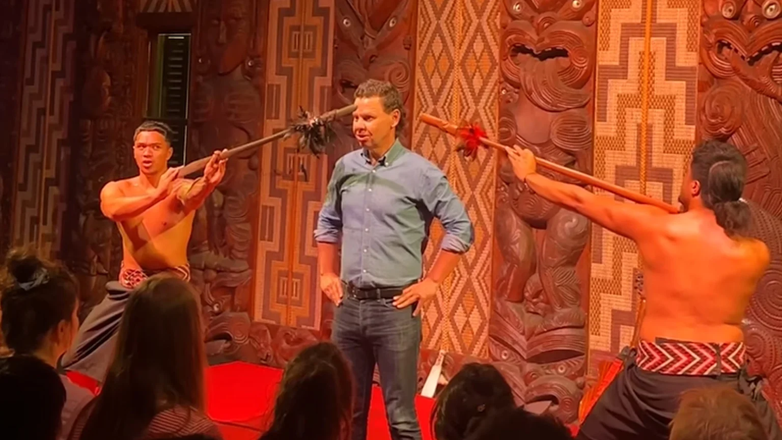 Paddy was brought to the front of the stage during the taiaha demonstration, and as the group closed in on him, he forgot to breathe for a moment.