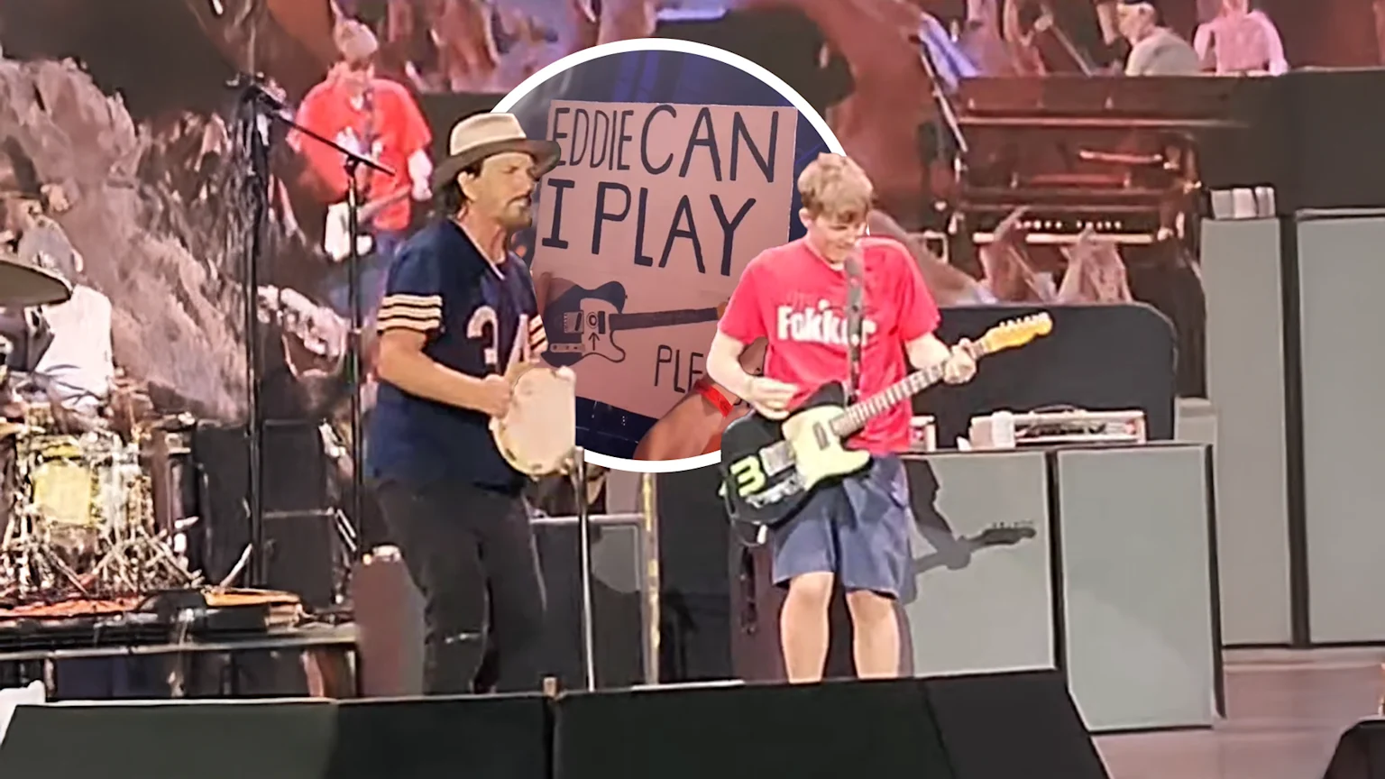 17-year-old Leon Fenemor stood in the crowd with a painted sign reading ‘Eddie can I play guitar please?’ on one side, and a list of song requests on the other. Among his picks were the Neil Young classic, alongside Pearl Jam songs like 'Scared of Fear', 'Evolution', 'Wreckage', 'Better Man', 'Corduroy', and 'Rearview Mirror'.