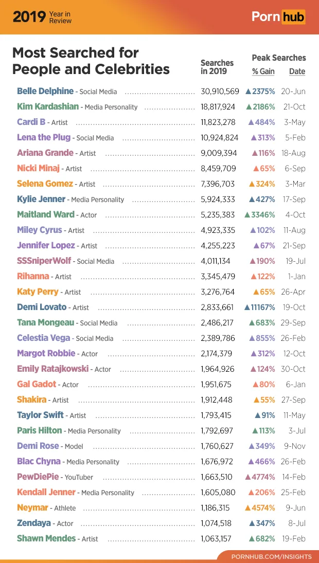 The previously mentioned Belle Delphine was the most searched for celebrity, followed by Kim Kardashian, Cardi B and whole lot more pop and hip hop artists.