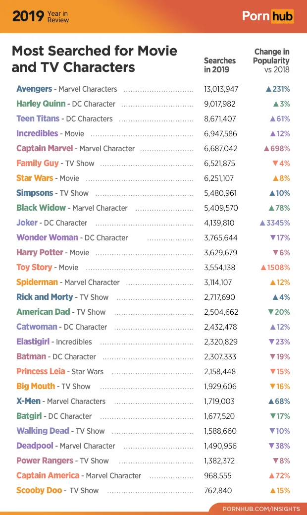 Fictional characters were in high commodity too. With blockbuster movies like Avengers and Joker released this year, these were reflected in porn searches.