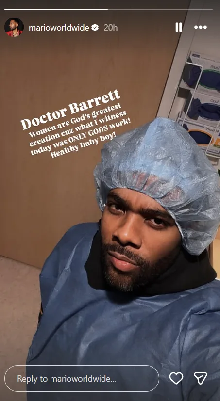 Mario, whose full name is Mario Dewar Barrett, announced the happy news on Monday night via his Instagram Stories, sharing a photo of himself wearing scrubs in what appeared to be a hospital room.