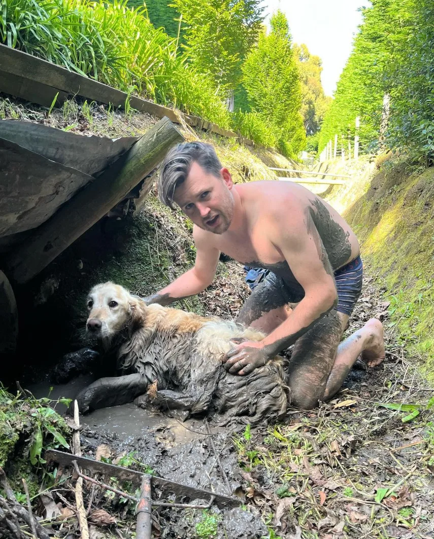 Adam and a neighbour created a chain effect with Adam holding the dog and the neighbour pulling Adam and eventually the dog was set free, but that was at the cost of a fair bit of Adam's pride after being covered in the filth.