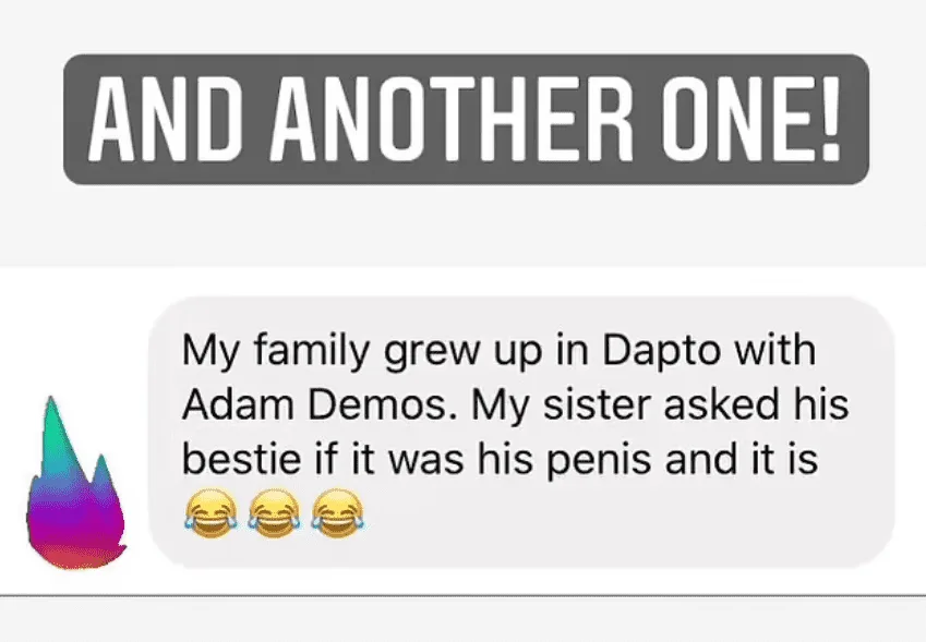 Someone else wrote, "My family grew up in Dapto with Adam Demos. My sister asked his bestie if it was his penis and it is."