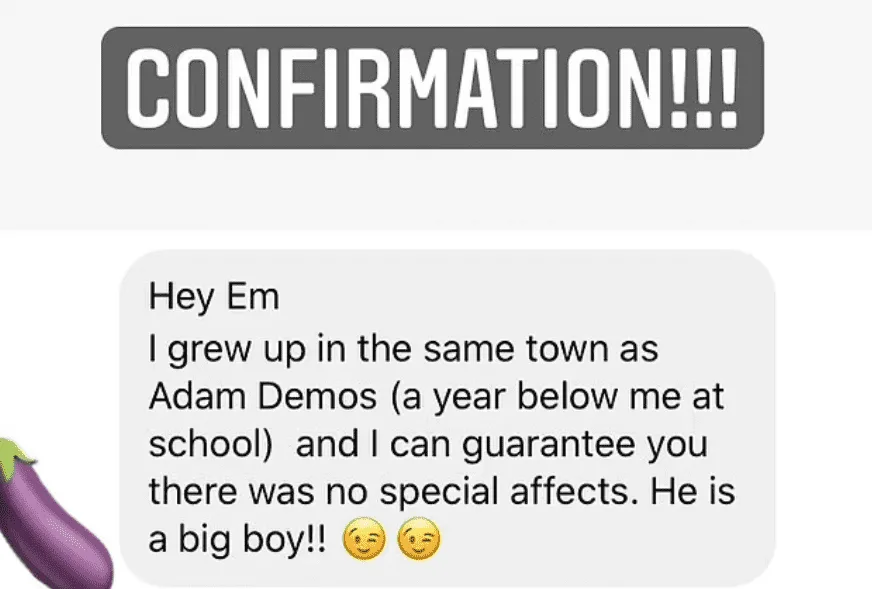 Em posted some private DMs she received on Insta over the weekend from women who grew up in the same town as Adam, allegedly confirming that his size is authentic.