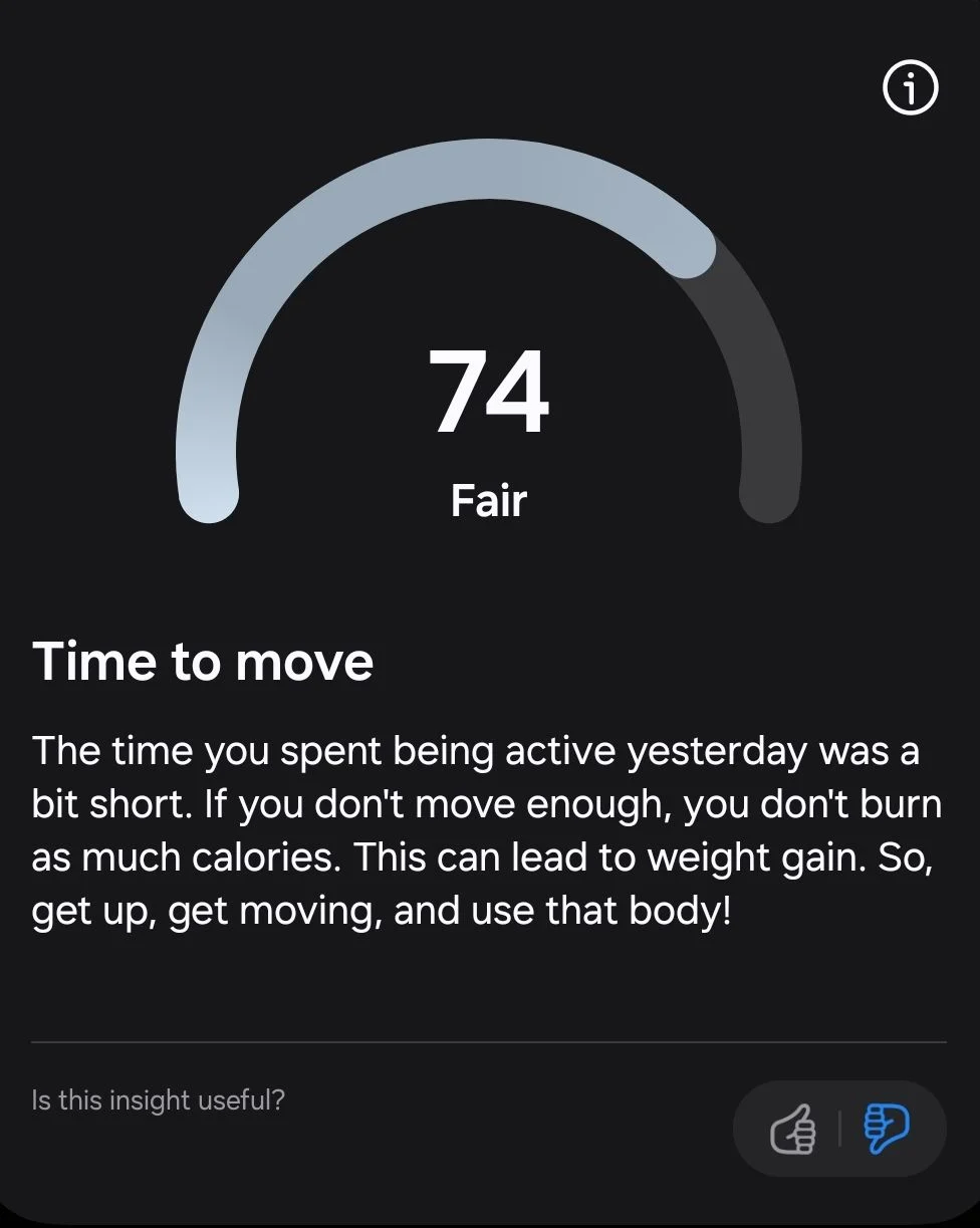 Some might find the AI a little blunt, but I’m a strong, resilient woman, so it only made me cry once - when it hit me with, “The time you spent being active yesterday was a bit short. If you don't move enough, you don't burn as much calories.This can lead to weight gain, so get up”