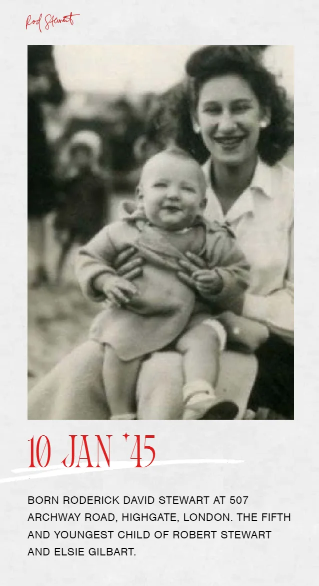 The timeline starts from when he was a baby back in 1945 to the present 77 year-old Sir Rod Stewart in 2022.