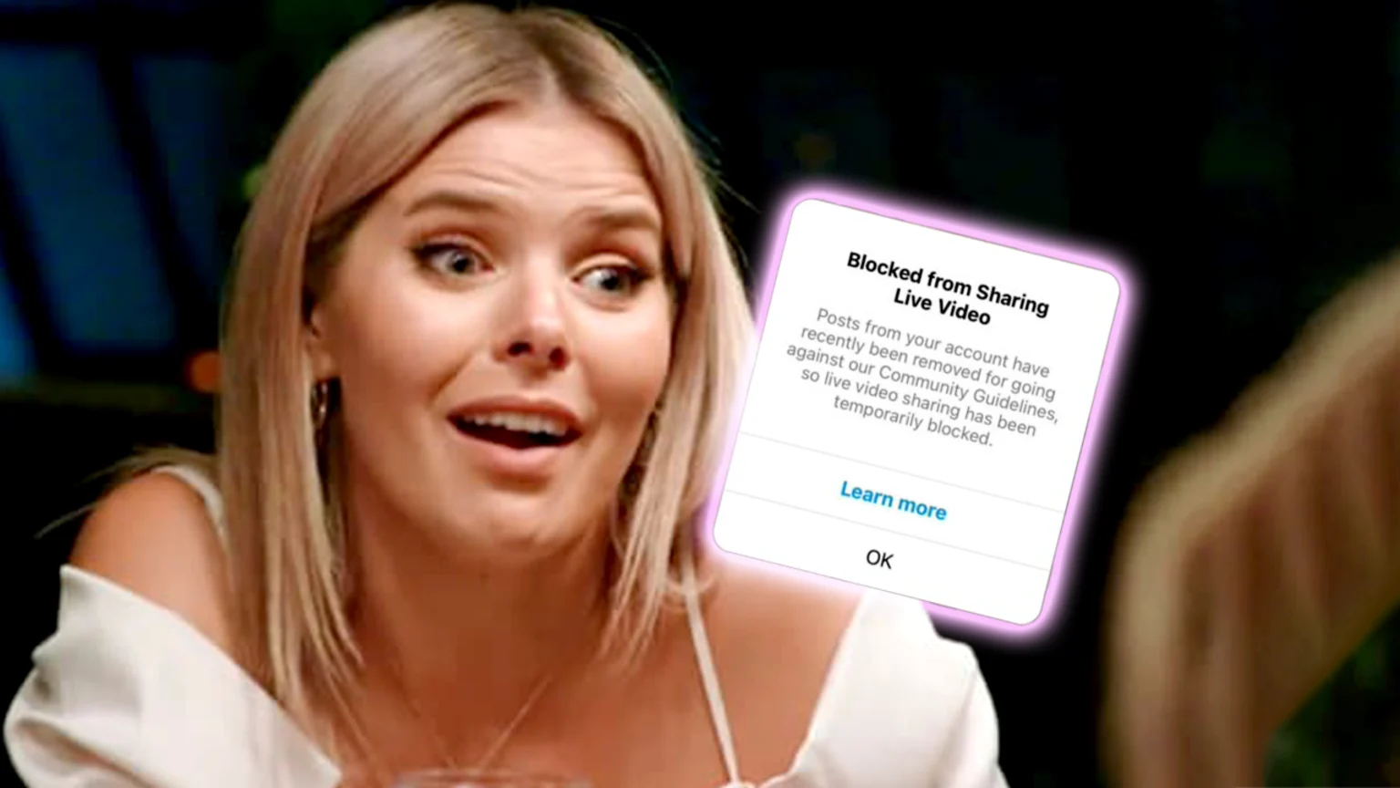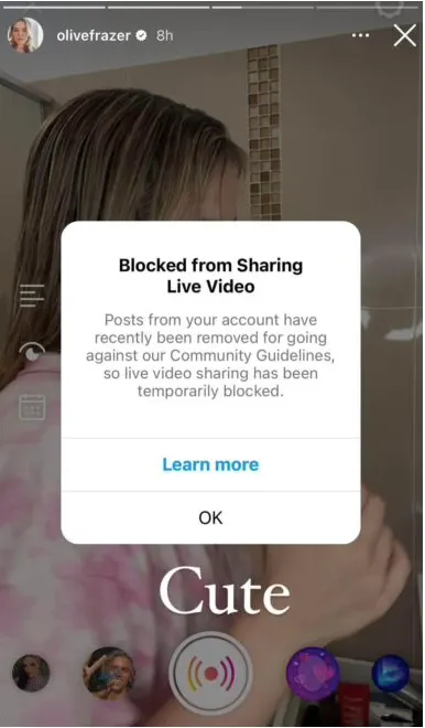 The screenshot of the error reads: "Post from your account have recently been removed for going against our Community Guidelines, so live video sharing has been temporarily blocked."