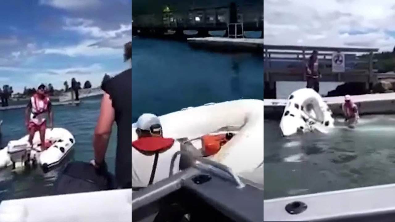 Footage has emerged online of an altercation between a man in an inflatable dinghy and a woman in a larger boat, with children on board.