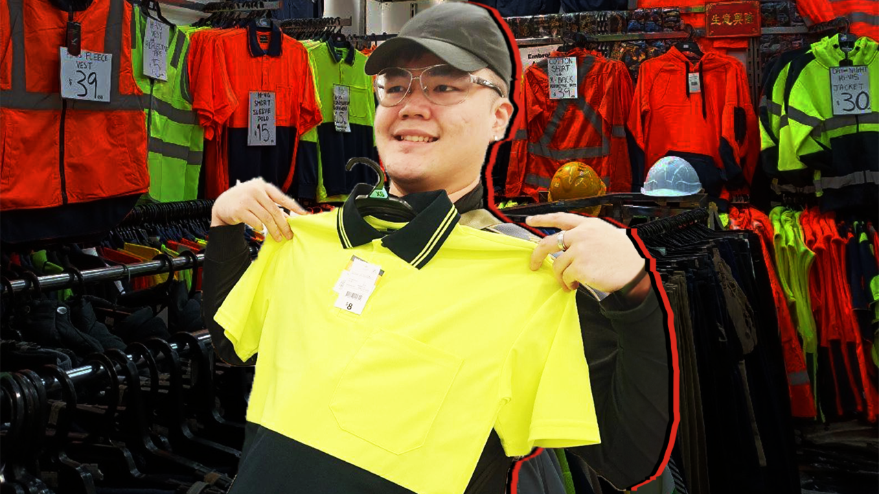 One bloke from Singapore is on a slippery slope to mince and cheese pies, darts, and borderline chat after falling in love with tradie hi-vis shirts during a trip to Australia.