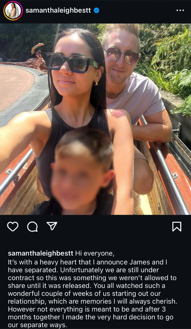 Sam shared an announcement on Insta, confirming her split to James and apologising for keeping it under wraps while they waiting for their contracts to the show to finish.