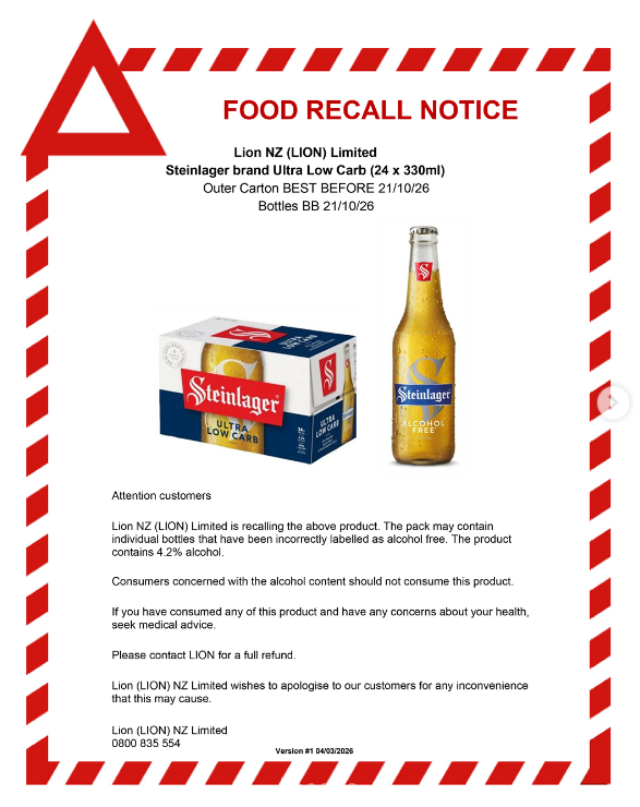 Vincent Arbuckle, deputy director-general at New Zealand Food Safety, says this recall is especially important for anyone avoiding alcohol for medical, cultural, or lifestyle reasons.
