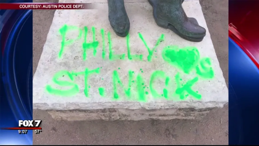 The latest vandalism happened a day after Philadelphia Eagles won the Super Bowl. included the words "Philly loves" and "St. Nick" sprayed in green paint and a Philadelphia Eagles jersey draped over the statue.