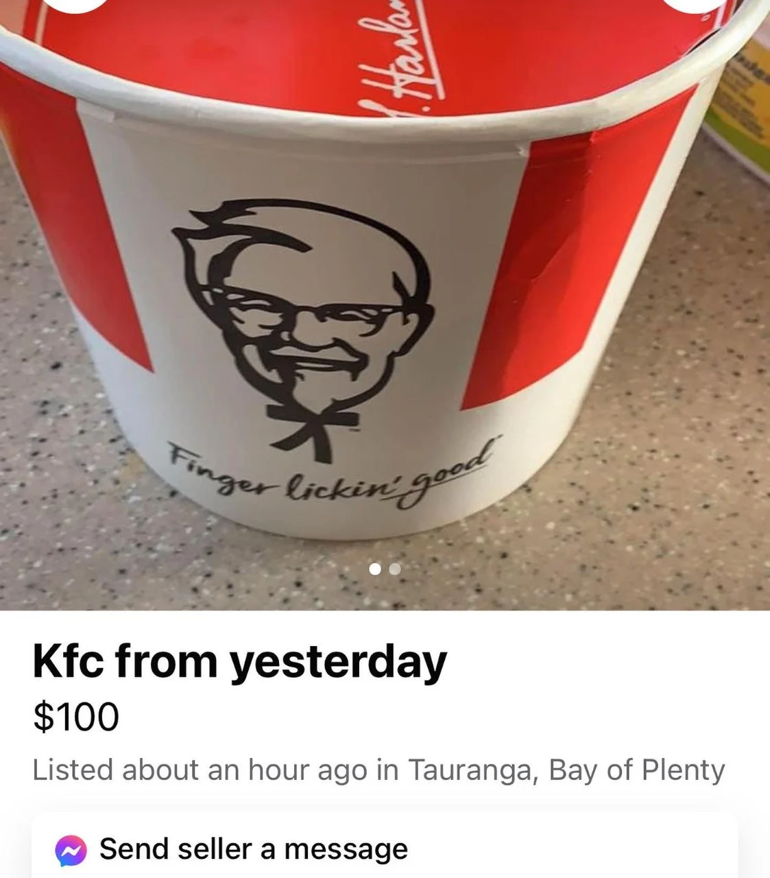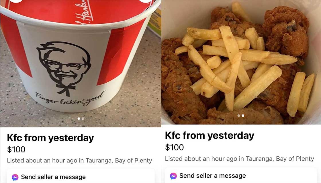 A Tauranga man is selling his leftover KFC on Facebook Marketplace for a whopping $100. He posted the finger lickin' good bucket with the description: