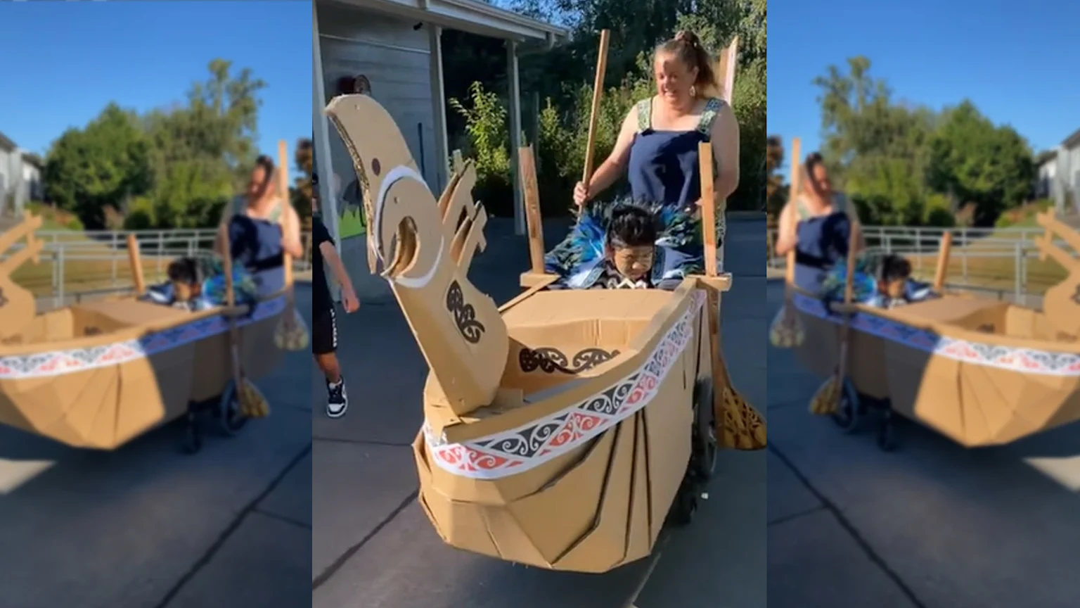 Cassius’ mum, Courtney Naera, shared a video of the genius costume created by teacher aide Faith - a self-paddling waka made from cardboard.