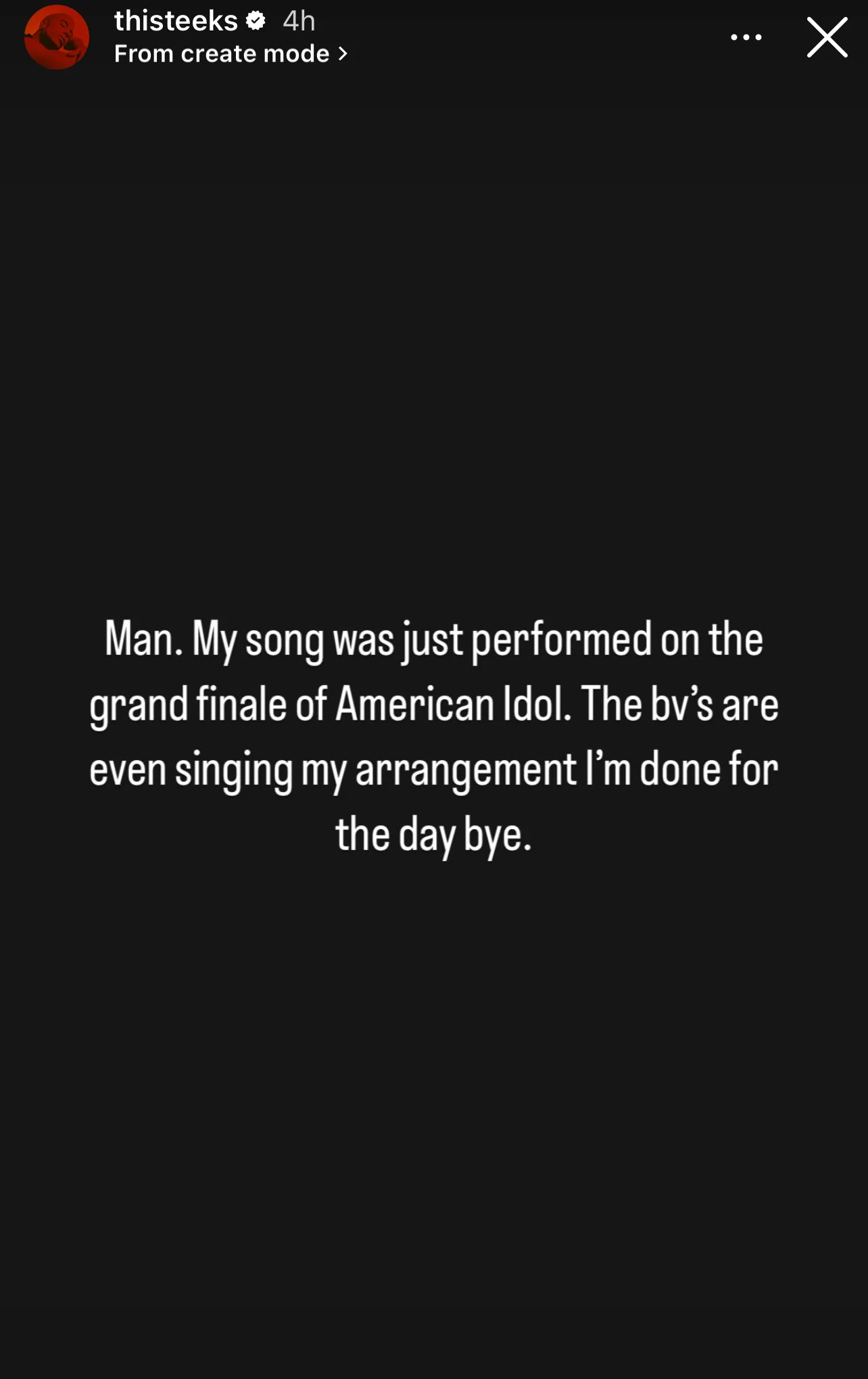 Teeks himself reacted to the stunning cover on his Instagram Story, writing: “Man. My song was just performed on the grand finale of 'American Idol'.”