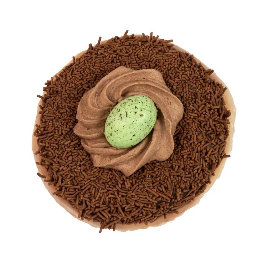 The Easter Nest Doughnut is dipped in choc, dunked in sprinkles, swirled with choc crème, and then topped with a Darrell Lea Speckled Egg.