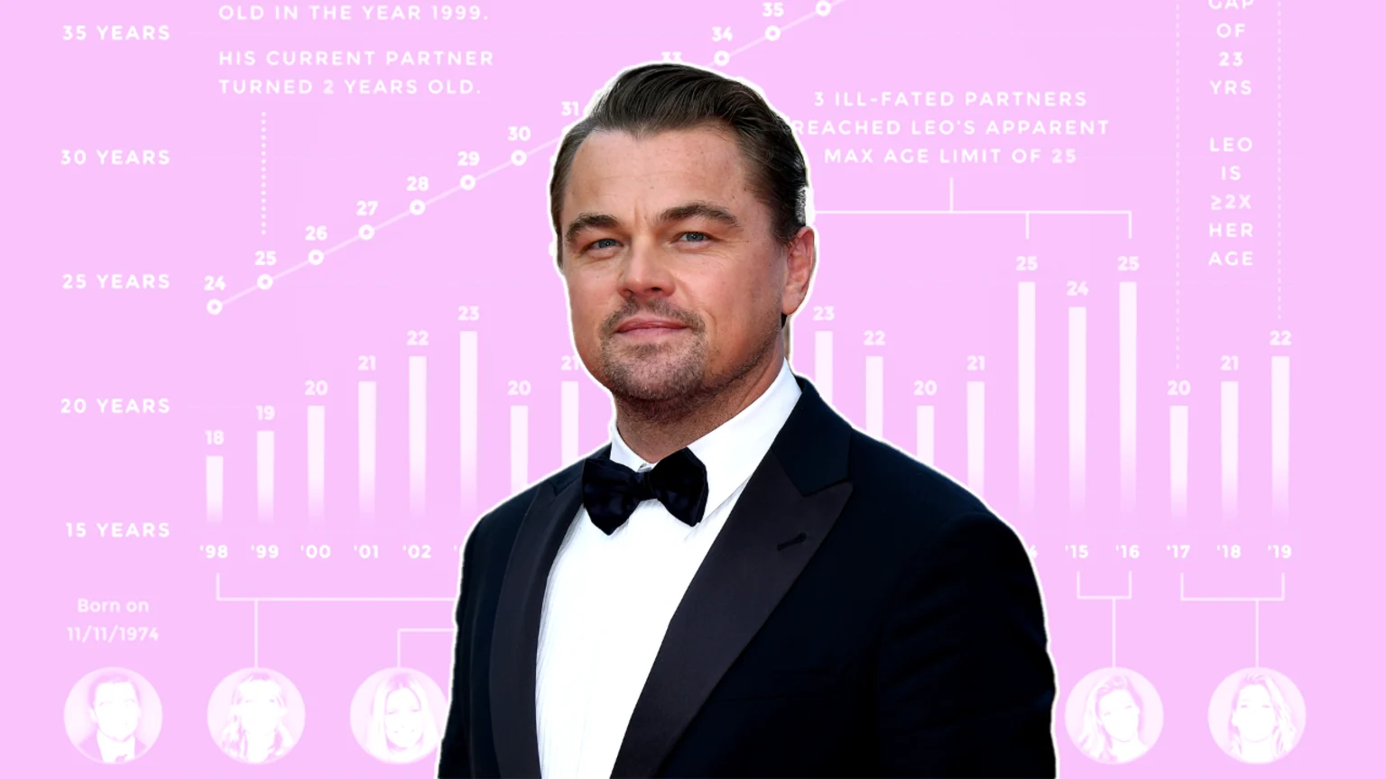 You can see Leo himself aging over time, but his dating range seems to peak at the, ahem, ripe age of 25.