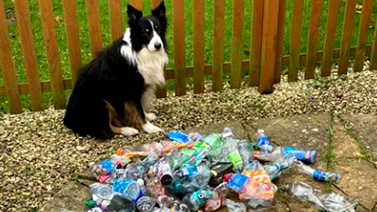 An oh-so-clever pup is helping clear the streets of litter by collecting and recycling hundreds of plastic bottles during his daily walks.