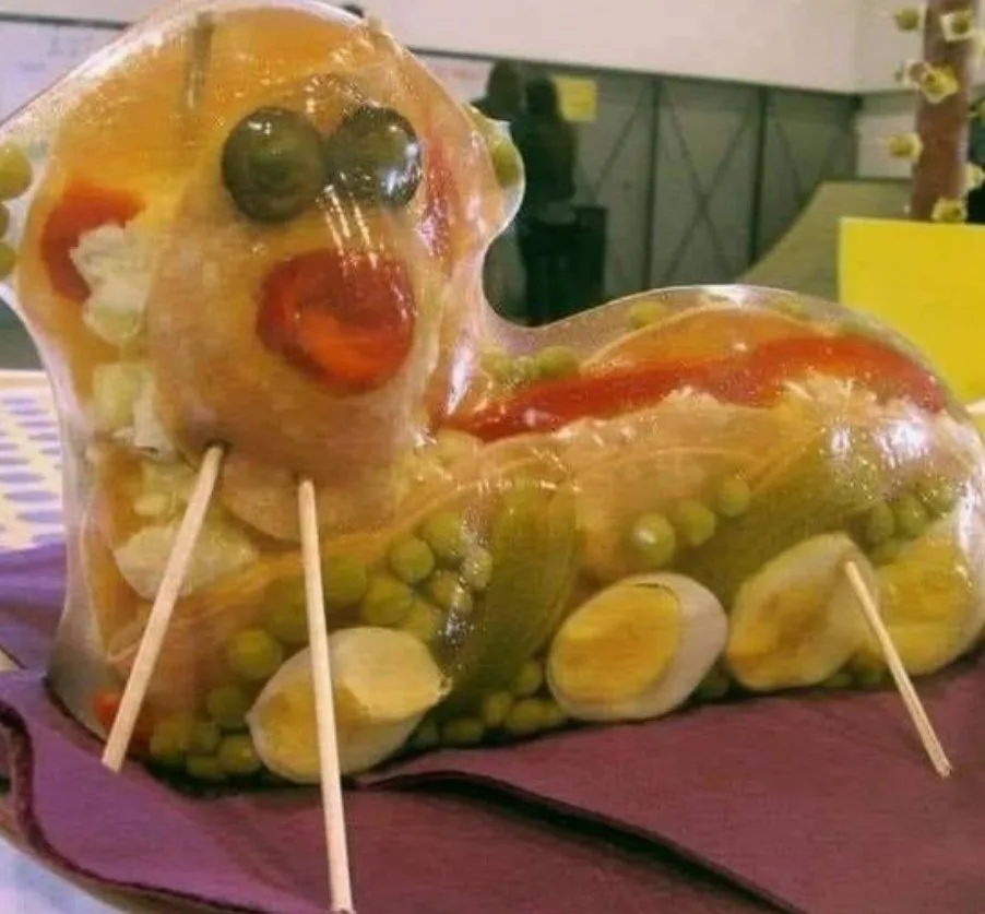 Pearl Diver's "Shiny Fella" isn't your usual takeaway dinner. Inspired by a 70s Edmonds Cook Book aspic recipe, it's a wobbly, feline-shaped gelatin sculpture packed with all sorts like peas, boiled eggs, gherkins and luncheon meat.