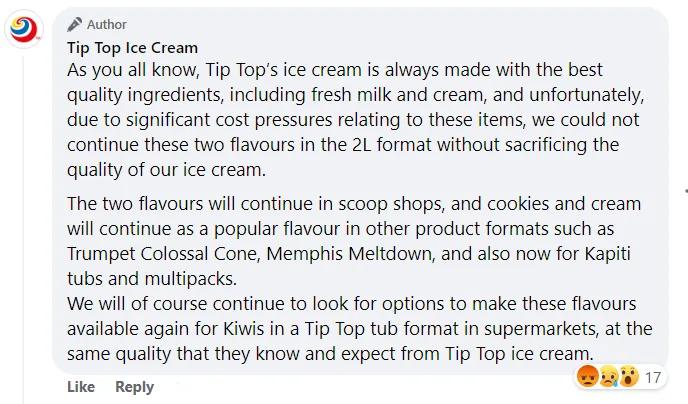 "As you all know, Tip Top's ice cream is always made with the best quality ingredients, including fresh milk and cream, and unfortunately, due to significant cost pressures relating to these items, we could not continue these two flavours in the 2L format without sacrificing the quality of our ice cream," they wrote,.
