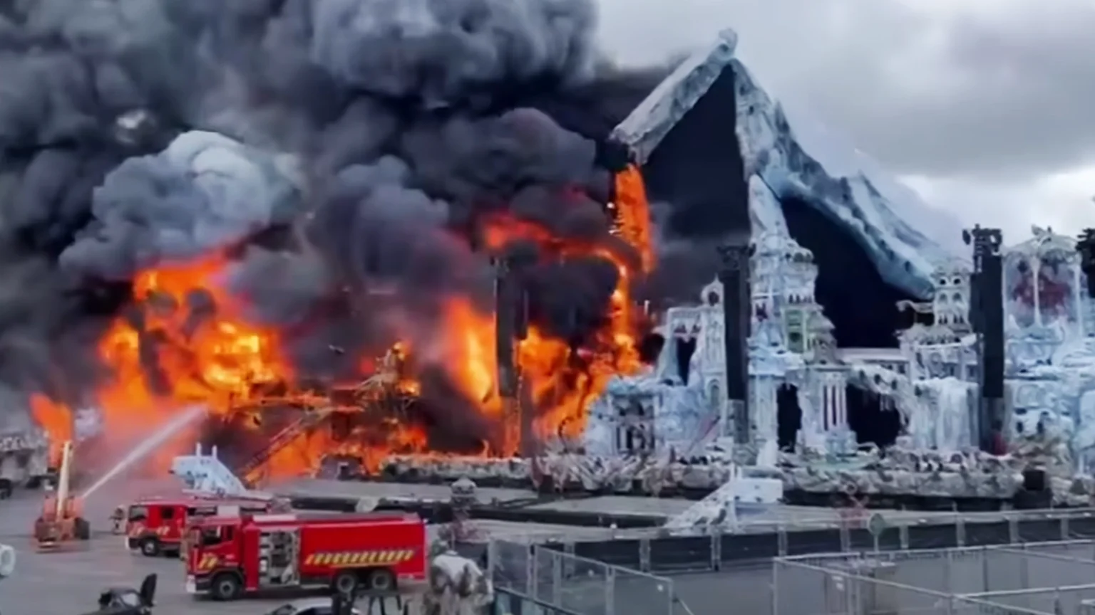 Footage has quickly appeared online showing the iconic stage engulfed in flames, and smoke covering the festival site.