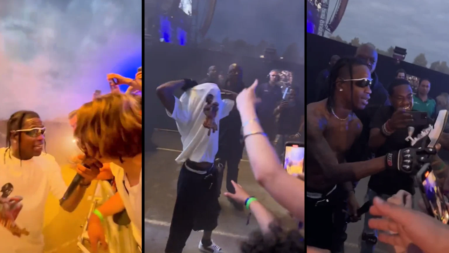 Travis Scott hands over his shirt and shoes to a massive young fan mid-show