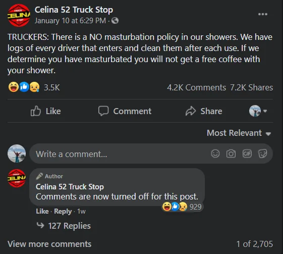 TRUCKERS: There is a NO masturbation policy in our showers. We have logs of every driver that enters and clean them after each use. If we determine you have masturbated you will not get a free coffee with your shower.