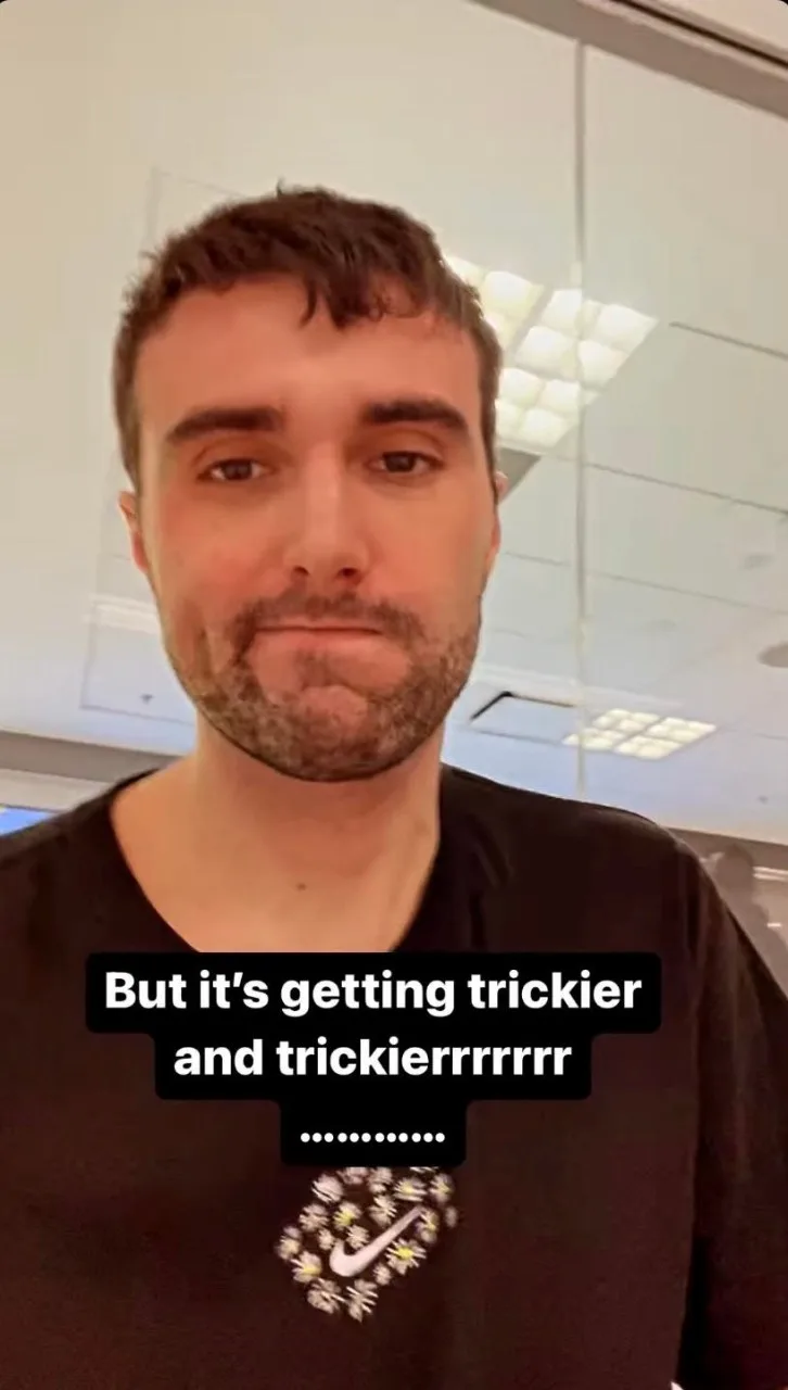 The next story is a selfie video of Fred with an unimpressed expression on his face as he sits in a waiting room. "But it's getting tricker and trickierrrrrrr," is written over it.