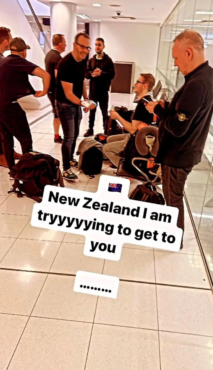 In the first story he writes: "New Zealand. I am tryyyyying to get to you.........." over a photo of his team standing around in what is definitely an airport, but hard to tell what airport it is.