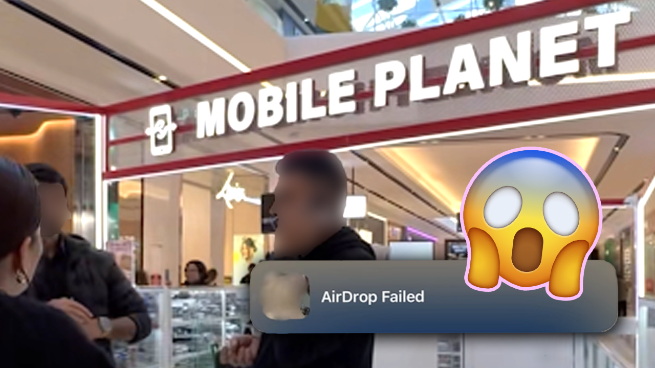 The manager is seen trying to diffuse and deny the situation, despite there being a notification reading "AirDrop failed" on the customer's phone.