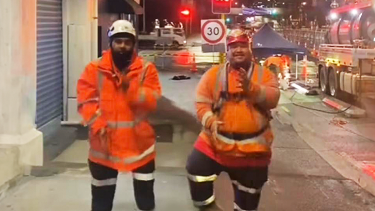 WATCH: Auckland road workers go viral for hitting the crack-up dance party during mahi