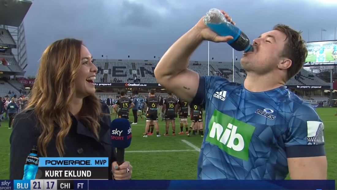 During his post-match interview, Eklund was given a blue powerade. Like any good rugby hooker, his first response was "should I boof it?"