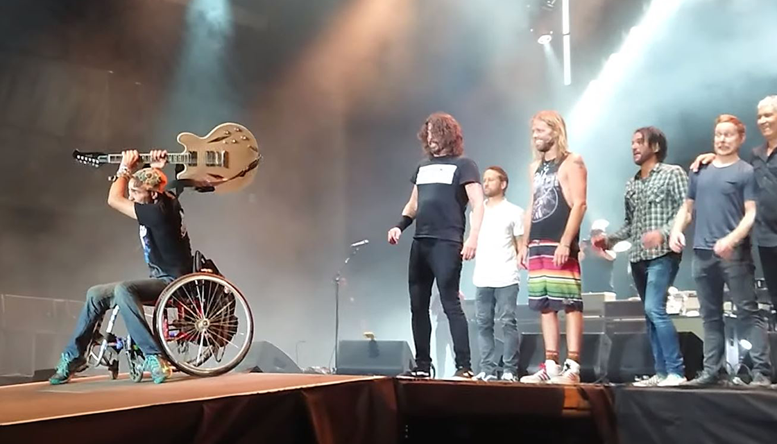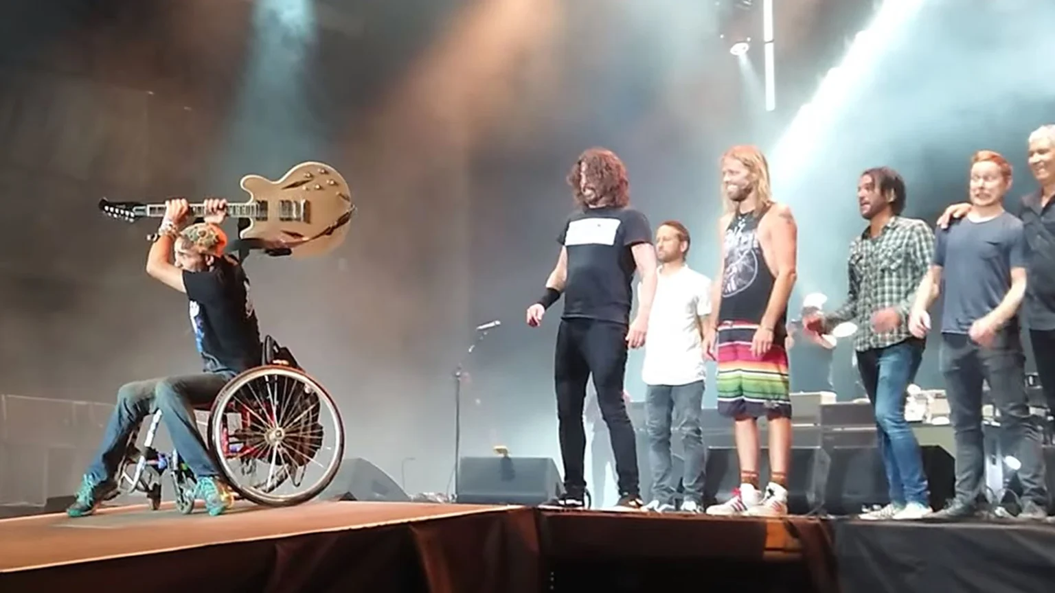 The bloke was able to watch the rest of show from side of stage. But at the end of the gig, Grohl invited the fan in the wheelchair to join the band on stage and smash one of his guitars! Check out the moment below. The magic moment happend after 8:45.