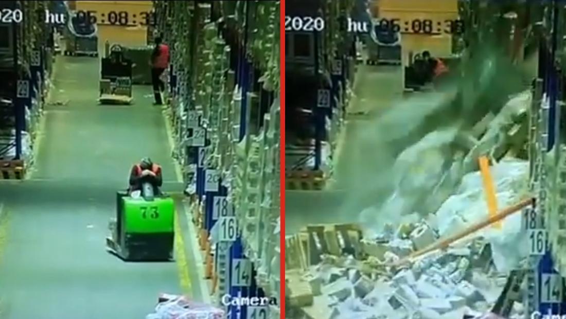 CCTV footage of an unlucky worker falling asleep at the wheel of his forklift has been shared around the internet lately. The footage shows the worker heading straight into a bunch of shelves after falling asleep, and thousands of dollars worth of stock crumbling down moments later.