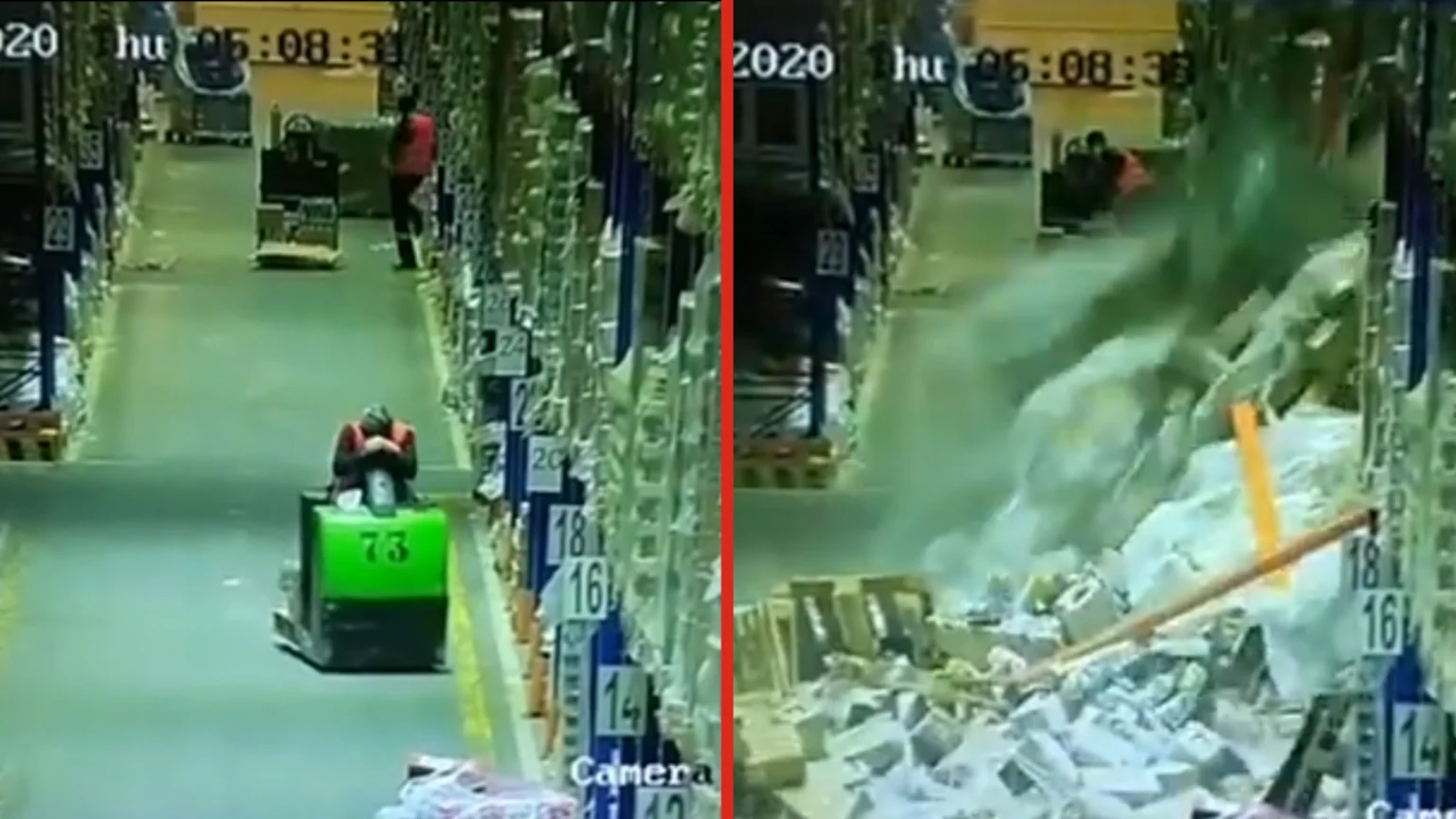WATCH: Forklift driver falls asleep at the wheel, causing thousands of dollars worth of stock to fall