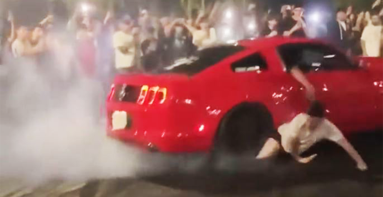 Some guy managed to get his pants pulled down by a Mustang mid-burn-out in one of the craziest videos we've seen in a while.