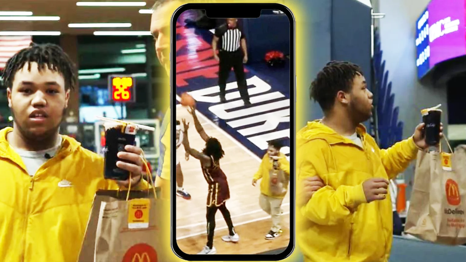 WATCH: Guy holding Maccas delivery order walks on court during a college basketball game