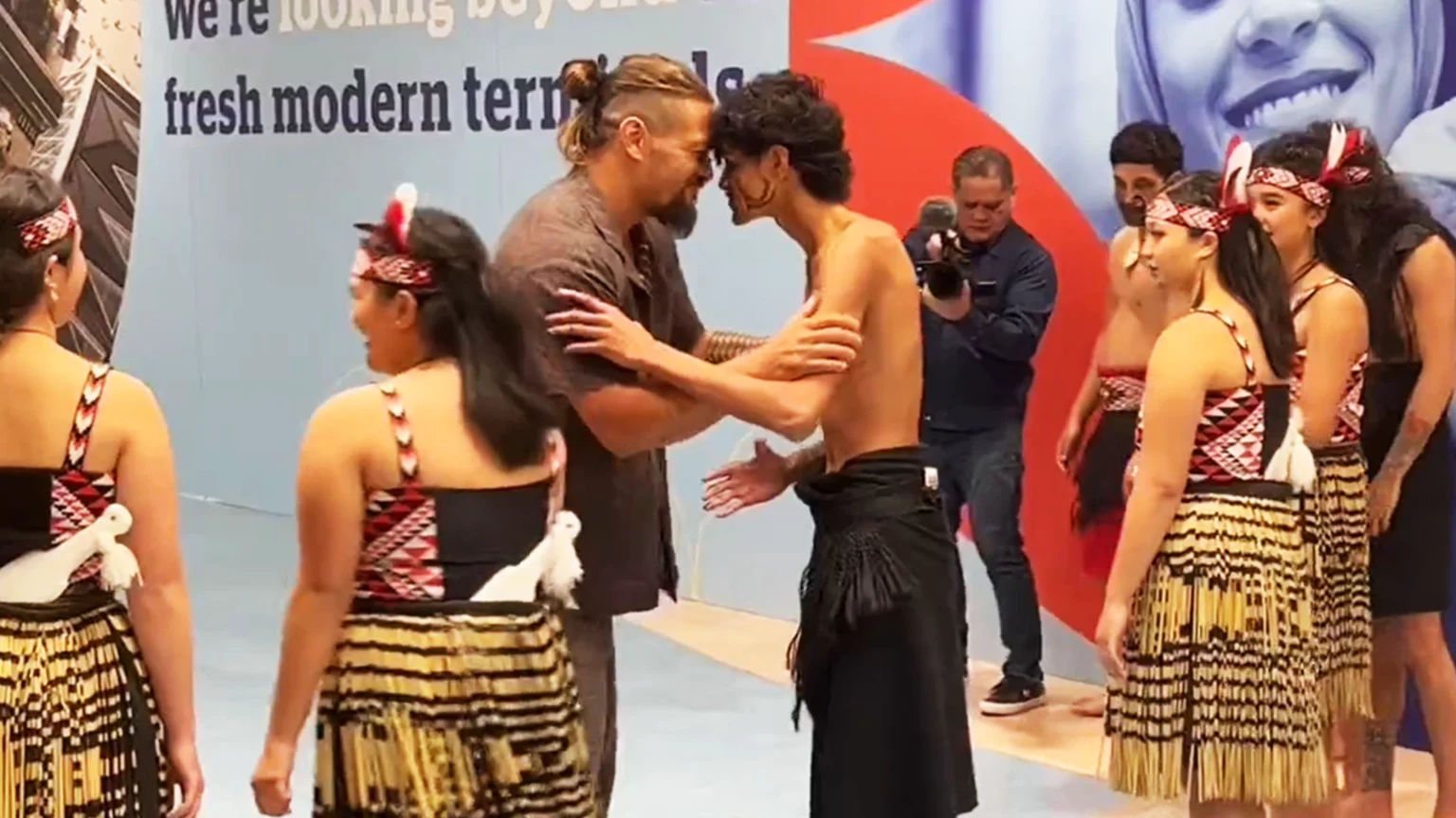 WATCH: Jason Momoa stoked with powerful powhiri greeting at Auckland Airport