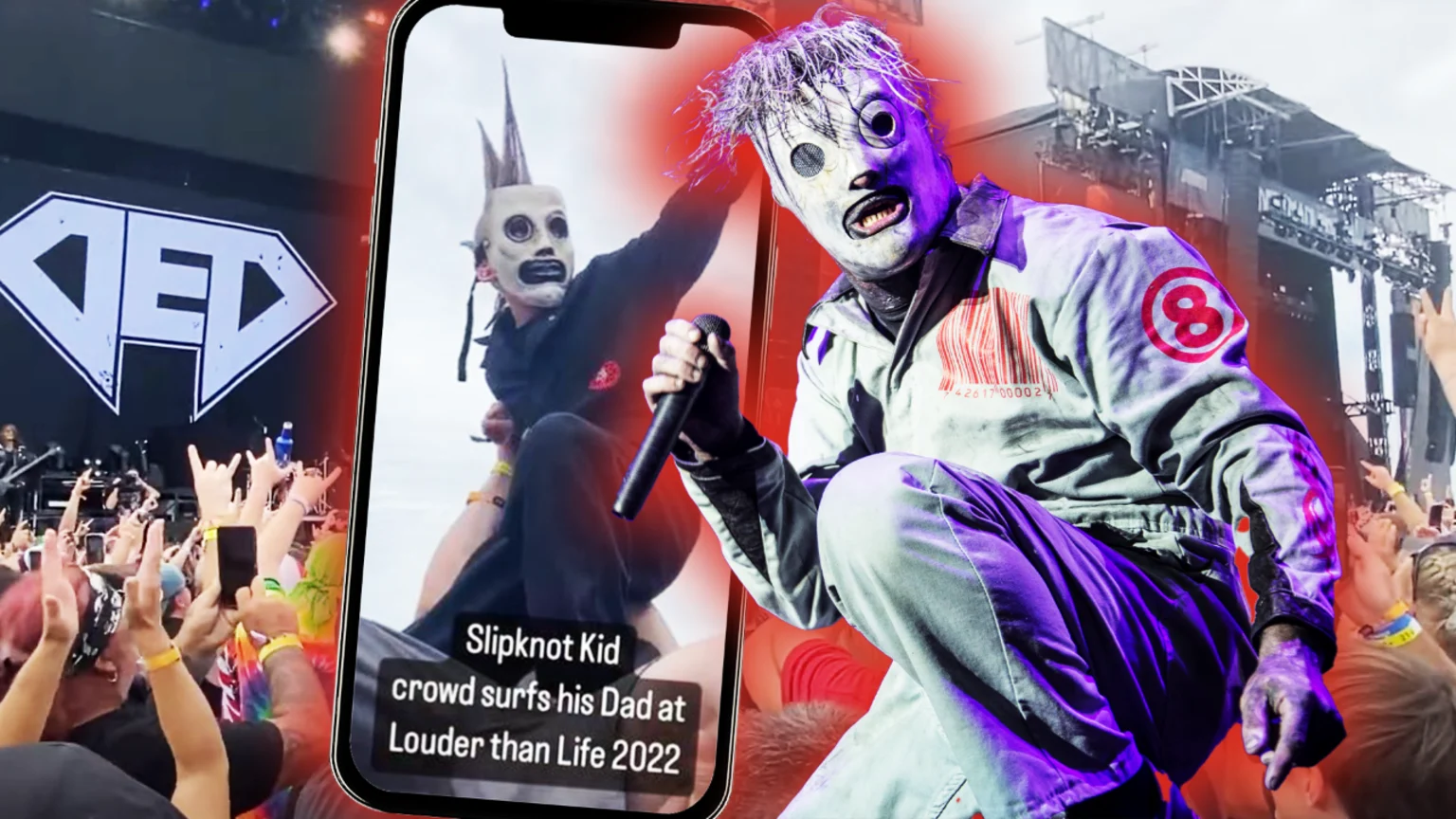 WATCH: Kid in a full Slipknot outfit crowd surfs at a rock festival with the help of his dad