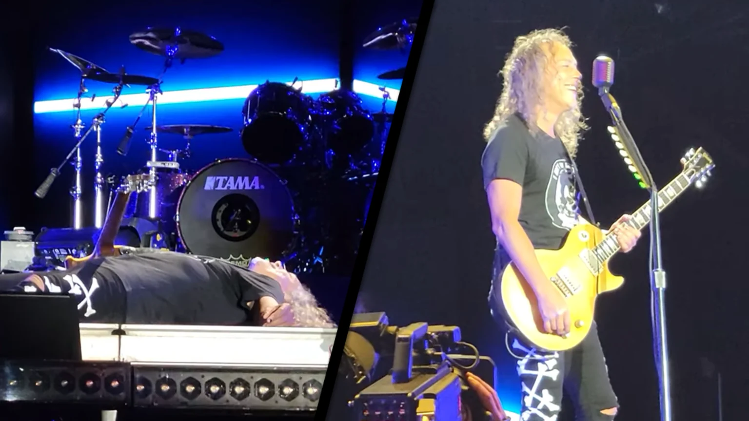 Hammett jokingly fell to the floor after the guitar-blunder, and bassist Robert Trujillo mimed as if he was fanning him, before Hammett gets up and says "sorry guys, you're so kick-ass; I got distracted by how kick-ass you are."